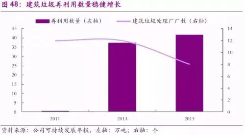 早在2000年初,公司便積極發(fā)展建筑垃圾的回收工作。公司在2009年至2014年間,通過10余家建筑垃圾回收廠占據(jù)了穩(wěn)定市場份額,建筑行業(yè)的季節(jié)性高峰特性也為公司在夏季的營業(yè)收入做出了可觀貢獻。而在2011年,公司又創(chuàng)新式的推出了“分散回收跟蹤工具”,通過跟蹤使用在工程中的重復利用建筑材料,幫助工程項目方更好地完成綠色建筑的目標。截止2015年,通過跟蹤工具的幫助,已有多達 41萬噸的建筑垃圾得到回收或再利用,比2013年的37萬噸增長10%。