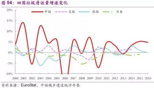 增速方面,美國近30年間雖持續(xù)增長,但復合年均增速不足1%;德國基本實現(xiàn)固廢0增長;日本更是從2000年起連年實現(xiàn)固廢負增長。中國近30年復合年均增速略超5%,近7年基本維持在4%左右。按照《“十三五”全國城鎮(zhèn)化生活垃圾無害化處理設(shè)施建設(shè)規(guī)劃》,預計到2020年中國垃圾清運量將達4億噸,未來4年年均增速有望持續(xù)超10%。