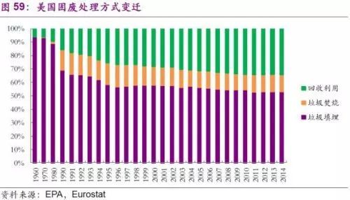 美國在經(jīng)歷了1980—2000年期間大規(guī)模的“去填埋化”后,近年來固廢處理方式較為穩(wěn)定,填埋仍是其主流處理方式,2014年占比近53%,垃圾焚燒和回收利用占比分別為13%和34%。由于垃圾焚燒有著處理成本較高,領(lǐng)避效應等不利因素,該處理方式恐較難在美國進一步發(fā)展?;厥绽媚壳半m因分揀環(huán)節(jié)成本較高,導致近年來在美國的發(fā)展速度有所放緩,但是我們認為,隨著垃圾分類觀念的進一步普及,和龍頭企業(yè)市場化力度的進一步加大,美國回收利用處理占比有望進一步提升。