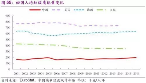 年度人均垃圾產(chǎn)生與清運量與經(jīng)濟發(fā)展水平正相關(guān)。美國常年保持在700千克/人?年以上,位居全球之首。德國稍次,近十年恢復到600千克/人?年水平。日本率先提出3R(減少原料、再利用、資源回收)的固廢處理標準并堅持執(zhí)行,近20年來人均垃圾清運量已減至300千克/人?年左右。中國雖然總垃圾清運量已位居全球第一,但人均垃圾清運量距其他三國尚有不小距離,隨著城鎮(zhèn)垃圾清運率的進一步提升,以及農(nóng)村垃圾產(chǎn)生及清運量的進一步提升,中國環(huán)衛(wèi)市場存在較大空間。