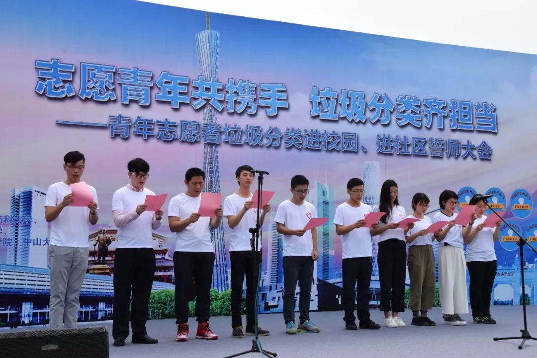 △2017年5月6日,廣州市番禺區(qū)大學(xué)城中心湖公園召開“志愿青年共攜手,垃圾分類齊擔(dān)當(dāng)”為主題的青年志愿者垃圾分類進(jìn)校園、進(jìn)社區(qū)誓師大會,大學(xué)生宣誓現(xiàn)場 。