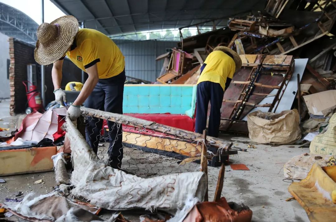 △城管委帶隊(duì)督查花都區(qū)垃圾分類成效,供銷社垃圾分類點(diǎn),工作人員在將回收回來的低附加值廢棄家具進(jìn)行破拆,分類成木材、布料、海綿等經(jīng)行回收。圖為工作人員在破拆一張沙發(fā)