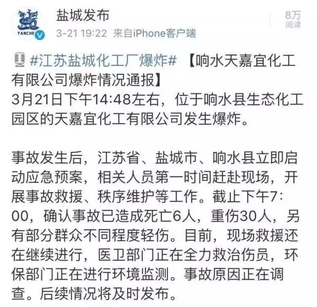 事故發(fā)生后,江蘇省、鹽城市、響水縣立即啟動應(yīng)急預案,相關(guān)人員第一時間趕赴現(xiàn)場,開展事故救援、秩序維護等工作。截至3月21日下午7:00,確認事故已造成死亡6人,重傷30人,另有部分群眾不同程度輕傷。目前,現(xiàn)場救援還在繼續(xù)進行,醫(yī)衛(wèi)部門正在全力救治傷員,環(huán)保部門正在進行環(huán)境監(jiān)測。事故原因正在調(diào)查。后續(xù)情況將及時發(fā)布。