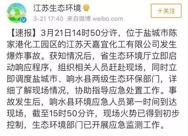 據(jù)@鹽城發(fā)布,3月21日下午14:48左右,位于響水縣生態(tài)化工園區(qū)的天嘉宜化工有限公司發(fā)生爆炸。