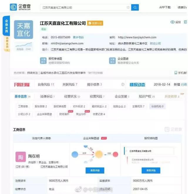 企查查數(shù)據(jù)顯示:江蘇天嘉宜化工有限公司成立于2007年,陶在明任法定代表人,注冊資本9000萬人民幣,經(jīng)營范圍包括間羥基苯甲酸、苯甲醚、KSS等精細化工產(chǎn)品制造、化工產(chǎn)品銷售等業(yè)務(wù)。
