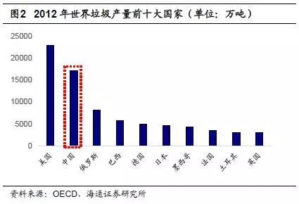 我國城鎮(zhèn)垃圾產(chǎn)量巨大。根據(jù)國家統(tǒng)計(jì)局?jǐn)?shù)據(jù),2000年我國的常住人口城鎮(zhèn)化率僅為36.22%,到2015年末為56.1%,年均增加1.33個百分點(diǎn),城鎮(zhèn)人口的不斷增加使得城鎮(zhèn)生活垃圾產(chǎn)生量與日俱增。根據(jù)OECD數(shù)據(jù),2012年我國垃圾清運(yùn)量僅次于美國,高居世界第二位,且遙遙領(lǐng)先于后面的俄羅斯、巴西、德國等國家。根據(jù)國家統(tǒng)計(jì)局?jǐn)?shù)據(jù),2001年我國垃圾清運(yùn)量為1.35億噸,2015年為1.91億噸,CAGR為3.27%。