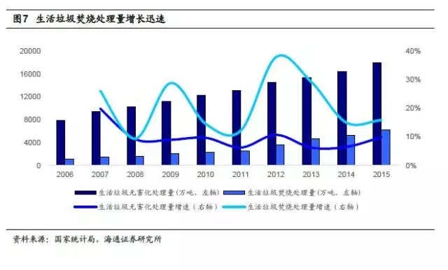我國生活垃圾焚燒處理量增長迅速,從2006年的1138萬噸增長至2015年的6176萬噸,十年間復(fù)合增速高達(dá)20.68%。
