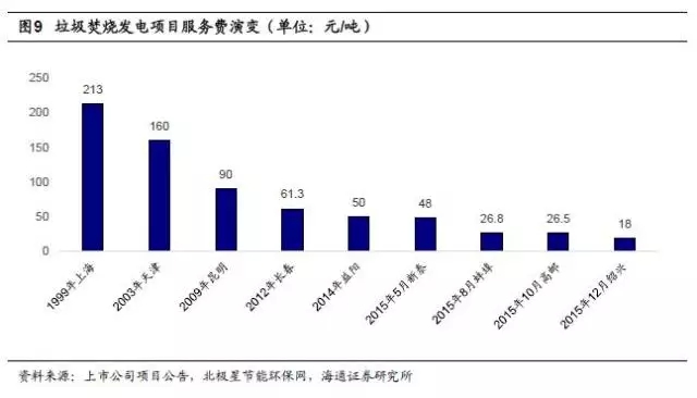 行業(yè)競爭加劇,處理費(fèi)下行。在市場參與者逐漸增多和行業(yè)競爭逐步加劇的背景下,近年新建的垃圾焚燒項(xiàng)目處理費(fèi)呈下降趨勢。2015年以來,一些企業(yè)為了搶占市場而壓低價格,低價中標(biāo)項(xiàng)目涌現(xiàn):2015年山東新泰項(xiàng)目中標(biāo)價48元/噸,安徽蚌埠項(xiàng)目中標(biāo)價26.8元/噸,江蘇高郵項(xiàng)目中標(biāo)價26.5元/噸,浙江紹興項(xiàng)目中標(biāo)價更是降至18元,擾亂市場正常秩序。除去少數(shù)惡意壓低價格的項(xiàng)目,根據(jù)中國經(jīng)濟(jì)導(dǎo)報統(tǒng)計(jì),近年來垃圾焚燒特許經(jīng)營項(xiàng)目處理費(fèi)每噸平均在60~80元,整體呈現(xiàn)小幅下降的趨勢。