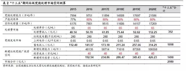 按照垃圾焚燒規(guī)劃新增處理能力對市場空間進(jìn)行測算,“十三五”期間垃圾焚燒處理費(fèi)市場空間總計(jì)近400億元,焚燒發(fā)電市場空間約1100億元,兩者合計(jì)運(yùn)營收入約1500億元;此外,新增處理能力所需的建設(shè)投資總計(jì)近1500億元,垃圾焚燒市場空間巨大。