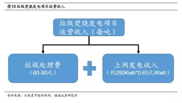 BOT模式下,垃圾焚燒項(xiàng)目的收入主要來自建設(shè)階段的工程收入和運(yùn)營階段的運(yùn)營收入。垃圾焚燒發(fā)電項(xiàng)目運(yùn)營階段收入主要為垃圾處理費(fèi)(政府補(bǔ)貼)以及上網(wǎng)發(fā)電收入。不同項(xiàng)目的垃圾處理費(fèi)價格差異較大,大致在50-150元/噸的區(qū)間里,目前大部分項(xiàng)目的平均水平在60-80元/噸。根據(jù)2012年4月發(fā)布的《國家發(fā)展改革委關(guān)于完善垃圾焚燒發(fā)電價格政策的通知》,每噸生活垃圾折算上網(wǎng)電量為280千瓦時,執(zhí)行全國統(tǒng)一垃圾發(fā)電標(biāo)桿電價每千瓦時0.65元(含稅,增值稅即征即退);超過部分電量執(zhí)行當(dāng)?shù)赝惾济喊l(fā)電機(jī)組上網(wǎng)電價。