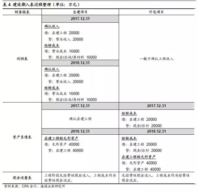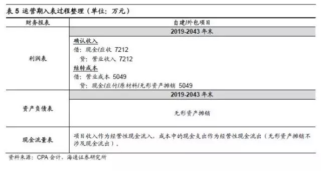 若該項(xiàng)目為項(xiàng)目公司自建,則建設(shè)期項(xiàng)目公司將根據(jù)完工進(jìn)度確認(rèn)工程收入并計(jì)入在建工程,項(xiàng)目完工后在建工程轉(zhuǎn)為無形資產(chǎn),工程階段雖有工程收入并確認(rèn)利潤,但并無實(shí)際經(jīng)營性現(xiàn)金流入。若項(xiàng)目公司將項(xiàng)目發(fā)包,通常不確認(rèn)工程收入,即建造期不影響利潤表,根據(jù)完工進(jìn)度向承包方支付工程款,確認(rèn)在建工程,項(xiàng)目完工后將在建工程結(jié)轉(zhuǎn)為無形資產(chǎn)。項(xiàng)目運(yùn)營階段,公司確認(rèn)項(xiàng)目運(yùn)營收入(主要是垃圾處理費(fèi)和上網(wǎng)發(fā)電收入),結(jié)轉(zhuǎn)相關(guān)成本,成本項(xiàng)包含無形資產(chǎn)的攤銷。項(xiàng)目建設(shè)期和運(yùn)營期的主要會計(jì)科目錄入如表4和表5: