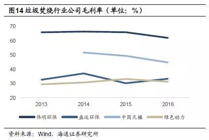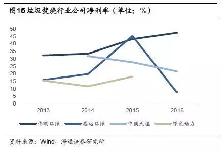 偉明環(huán)保項(xiàng)目運(yùn)營毛利率較高,2015年為65.9%,2016年小幅下降,為62.5%;中國天楹運(yùn)營業(yè)務(wù)毛利率也相對較高,2016年為49.2%,但相較于2014年的65.1%下滑近16個百分點(diǎn);綠色動力2015年毛利率為49.0%;盛運(yùn)環(huán)保2015年運(yùn)營業(yè)務(wù)毛利率為45.3%,2016年為18.0%。