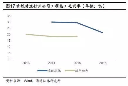 盛運(yùn)環(huán)保和綠色動力兩家公司確認(rèn)工程業(yè)務(wù)收入。工程業(yè)務(wù)毛利率方面,盛運(yùn)環(huán)保相對較高,2015年為29.4%,2016年下降至21.3%;綠色動力雖確認(rèn)工程業(yè)務(wù)收入,但項(xiàng)目主要系外包給其他方,建造收入根據(jù)獨(dú)立評估師評定的公允價值計(jì)量,毛利率較低,2015年為18.3%。