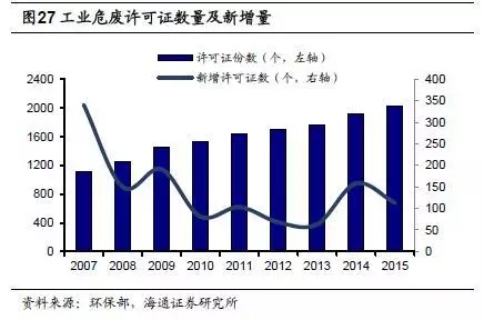 我國政府對危廢處理行業(yè)實(shí)行許可證制度。這一方面能夠保證從事危廢處理業(yè)務(wù)的公司基本擁有較強(qiáng)的技術(shù)實(shí)力和項(xiàng)目經(jīng)驗(yàn),從而保障危廢無害化處理的效率,減少處理不當(dāng)造成的二次污染;另一方面,實(shí)行許可證制度會限制新進(jìn)企業(yè)數(shù)量,限制全國危廢綜合利用和處置總量。
