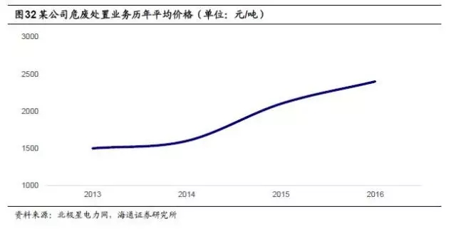 危廢處置價格穩(wěn)步上升,市場空間巨大。從核準(zhǔn)經(jīng)營規(guī)模看,危廢處置產(chǎn)能緊缺,2015年核準(zhǔn)處置規(guī)模僅982.4萬噸/年。近年來,危廢處置價格呈現(xiàn)穩(wěn)步上升趨勢。以行業(yè)內(nèi)某領(lǐng)先企業(yè)為例,2013年,其危廢處置業(yè)務(wù)平均價格為1500元/噸左右,2016年則上升至2500元/噸左右。以全國環(huán)境統(tǒng)計(jì)公報數(shù)據(jù)為基礎(chǔ),假設(shè)未來幾年危廢產(chǎn)生量保持過去十年復(fù)合增長率12%的增速,保守估計(jì)處置率為35%,單位處置成本為2500元/噸,則預(yù)計(jì)2020年危廢處置市場為613億元,2017-2020處置市場空間總計(jì)2086億元??紤]到還有大量的危廢沒有進(jìn)入國家統(tǒng)計(jì)口徑,若將這些量考慮在內(nèi),市場空間還將提升2-3倍。