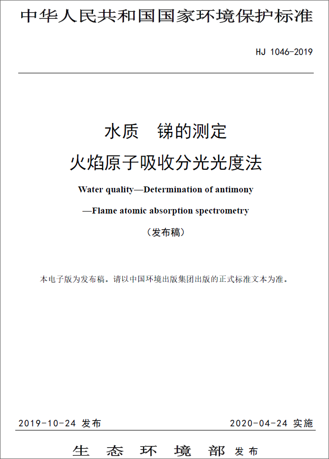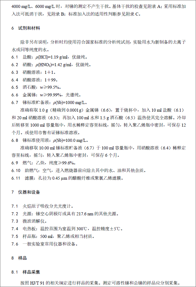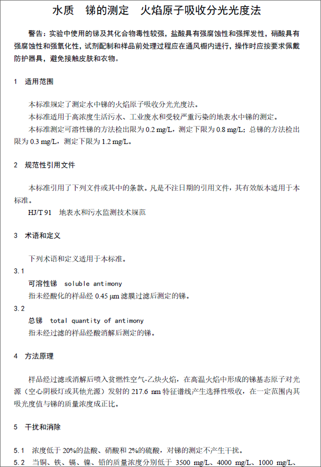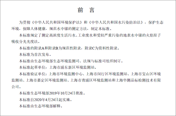 為貫徹《中華人民共和國環(huán)境保護法》和《中華人民共和國水污染防治法》,保護生態(tài) 環(huán)境,保障人體健康,規(guī)范水中銻的測定方法,制定本標(biāo)準(zhǔn)。本標(biāo)準(zhǔn)規(guī)定了測定高濃度生活污水、工業(yè)廢水和受較嚴(yán)重污染的地表水中銻的火焰原子吸收分光光度法。本標(biāo)準(zhǔn)的附錄A和附錄B為規(guī)范性附錄,附錄C為資料性附錄。本標(biāo)準(zhǔn)為首次發(fā)布。