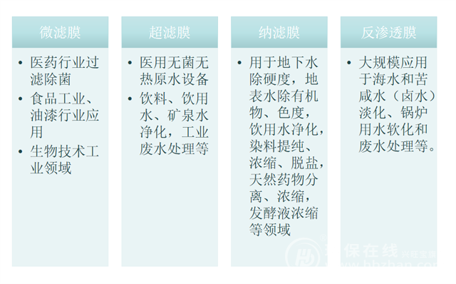 依據(jù)孔徑的不同(或稱為截留分子量的大小)可將膜分為微濾(MF)膜、超濾(UF)膜、納濾(NF)膜和反滲透(RO)膜等。按照不同應(yīng)用領(lǐng)域來(lái)看,超微濾膜與反滲透膜更為常見(jiàn)。其中超微濾膜主要應(yīng)用與污水處理和中水回用、給水凈化及海水淡化的水預(yù)處理階段;反滲透膜則可有效脫除溶鹽和部分有機(jī)物,對(duì)懸浮物的脫除更徹底,出水水質(zhì)可達(dá)飲用水標(biāo)準(zhǔn),主要應(yīng)用于脫鹽、超純水制造、海水淡化處理。