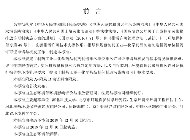 為貫徹落實《中華人民共和國環(huán)境保護法》《中華人民共和國大氣污染防治法》《中華人民共和國水污染防治法》《中華人民共和國土壤污染防治法》等法律法規(guī)、《國務院辦公廳關于印發(fā)控制污染物排放許可制實施方案的通知》(國辦發(fā)〔2016〕81號)和《排污許可管理辦法(試行)》(環(huán)境保護部令第48號),完善排污許可技術支撐體系,指導和規(guī)范制藥工業(yè)—化學藥品制劑制造排污單位排污許可證申請與核發(fā)工作,制定本標準。