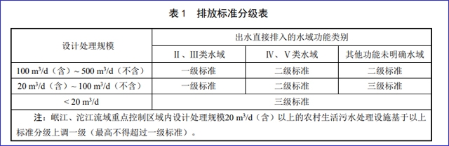 根據(jù)污水處理設(shè)施出水直接排入的水域功能類別和設(shè)計(jì)處理規(guī)模,將農(nóng)村生活污水處理設(shè)施水 污染物排放標(biāo)準(zhǔn)劃分為一級(jí)標(biāo)準(zhǔn)、二級(jí)標(biāo)準(zhǔn)和三級(jí)標(biāo)準(zhǔn),各級(jí)標(biāo)準(zhǔn)的適用情況見表1。其中,岷江、沱江流域重點(diǎn)控制區(qū)域內(nèi)(參見文末附件),設(shè)計(jì)處理規(guī)模20m³/d(含)以上的農(nóng)村生活污水處理設(shè)施對(duì)應(yīng)表1所列標(biāo)準(zhǔn)上調(diào)一級(jí)(最高不得超過一級(jí)標(biāo)準(zhǔn))。