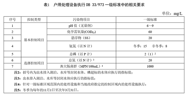 綜合考慮設(shè)施的處理規(guī)模、受納水體的環(huán)境容量、功能要求等多種因素,戶用處理設(shè)備出水直接排入GB 3838地表水Ⅱ、Ⅲ類功能水域(劃定的飲用水水源保護(hù)區(qū)和游泳區(qū)除外)、GB 3097海水二類功能水域、湖泊、水庫等封閉水域或半封閉水域時(shí),執(zhí)行DB 33/973中一級(jí)標(biāo)準(zhǔn)中的相關(guān)要求,詳見下圖: