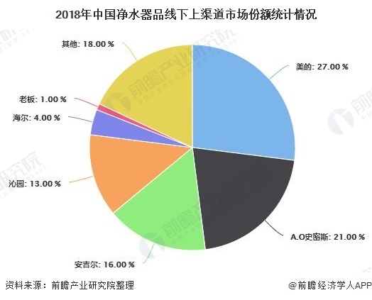 我國凈水器行業(yè)營銷市場主要分為線上和線下兩個零售市場。2018年,美的是我國凈水器在線上渠道份額占比第一的品牌,其份額達到16%;而在線下渠道市場份額第一的品牌也為美的,其占比為27%。