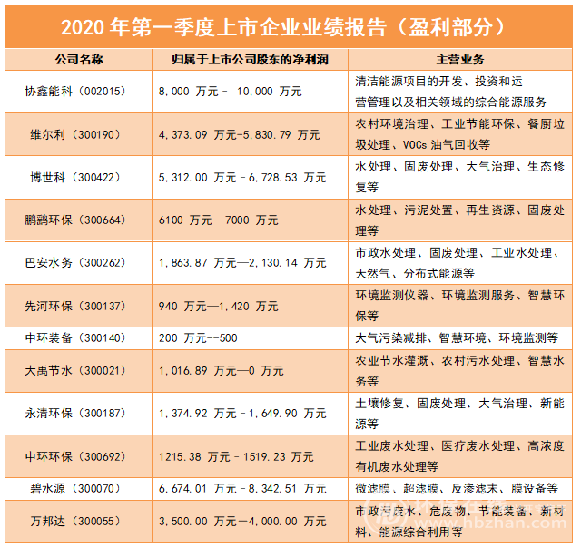 日前,多個環(huán)保企業(yè)發(fā)布了2020年第一季度(2020年1月1日-3月31日)的業(yè)績報告或預(yù)告。受疫情影響,很多工程項目等開工延遲、訂單減少,從而影響了很多環(huán)保企業(yè)的業(yè)績。但仍有很多企業(yè)實現(xiàn)了盈利,具體有哪些企業(yè)呢?