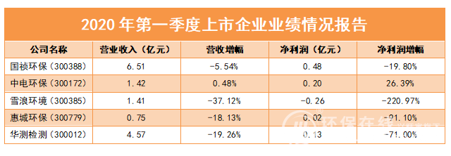 目前國禎環(huán)保、中電環(huán)保、雪浪環(huán)境、惠城環(huán)保和華測檢測已經(jīng)發(fā)布2020年第一季度的報告,具體營收情況如下: