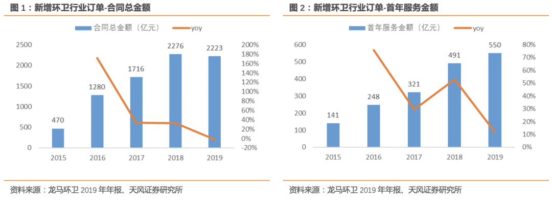 ▍環(huán)衛(wèi)行業(yè)市場化本輪加速的原因是什么?垃圾分類強(qiáng)制推動(dòng)經(jīng)過2015年至今的快速推廣,全國環(huán)衛(wèi)行業(yè)新增年化訂單已達(dá)550億,總合同額達(dá)到2223億元,連續(xù)兩年環(huán)衛(wèi)市場化新增合同總金額突破2000億元,市場化快速推廣。2018-2019年環(huán)衛(wèi)市場化快速推進(jìn)背后的主要原因,是垃圾分類強(qiáng)制實(shí)施的政策催化。▍環(huán)衛(wèi)服務(wù)行業(yè)的市場空間有多大?從傳統(tǒng)環(huán)衛(wèi)向城市物業(yè)管理擴(kuò)容傳統(tǒng)環(huán)衛(wèi)服務(wù)市場包括道路清掃、垃圾清運(yùn)、公廁維護(hù)等,預(yù)計(jì)每年運(yùn)營市場空間在1500億,隨設(shè)施增加和單價(jià)上漲,預(yù)計(jì)2020年可達(dá)2300億。垃圾分類市場是潛在市場空間接近千億的新興市場,而城市服務(wù)管理是更大的潛在市場,隨著城市管理體制從分散走向綜合,環(huán)衛(wèi)一體化項(xiàng)目增多,綠化養(yǎng)護(hù)、照明維護(hù)等更多內(nèi)容被打包進(jìn)來,環(huán)衛(wèi)企業(yè)面臨的市場空間逐步擴(kuò)容。▍環(huán)衛(wèi)裝備行業(yè)的市場空間有多大?存量需求崛起根據(jù)住建部的統(tǒng)計(jì)年鑒,2018年我國城市和縣城合計(jì)的道路清掃保潔機(jī)械化率約67.68%,達(dá)到基本環(huán)衛(wèi)裝備階段。基于機(jī)械化率提升產(chǎn)生的新增設(shè)備需求,和環(huán)衛(wèi)裝備折舊產(chǎn)生的存量替代需求,我們預(yù)測環(huán)衛(wèi)裝備存量更新需求將崛起,到2025年市場空間可達(dá)1025億/年,市場逐步釋放。▍環(huán)衛(wèi)服務(wù)的競爭格局如何?市場分散,行業(yè)集中度提升趨勢(shì)明顯環(huán)衛(wèi)服務(wù)行業(yè)參與者眾多,top5市場份額僅11.4%。目前行業(yè)內(nèi)參與者可大致分為環(huán)衛(wèi)專業(yè)服務(wù)商、國企改制單位、固廢終端處置商、環(huán)衛(wèi)設(shè)備制造商和環(huán)衛(wèi)信息化解決商等。2019年下半年以來PPP模式預(yù)期升溫,二次市場化的環(huán)衛(wèi)項(xiàng)目具有一定的規(guī)?;厔?shì),從而提高行業(yè)進(jìn)入門檻,預(yù)計(jì)環(huán)衛(wèi)服務(wù)行業(yè)的集中度將獲得明顯提升。▍環(huán)衛(wèi)裝備業(yè)的發(fā)展趨勢(shì)和競爭格局將如何?客戶和產(chǎn)品結(jié)構(gòu)升級(jí),競爭格局穩(wěn)定隨著環(huán)衛(wèi)市場化推進(jìn),裝備業(yè)的市場化客戶占比提升,裝備產(chǎn)品向新能源、智能化方向發(fā)展,TOP3市場份額約40%,行業(yè)格局將維持穩(wěn)定。我們認(rèn)為環(huán)衛(wèi)服務(wù)龍頭企業(yè)將同時(shí)受益于行業(yè)空間擴(kuò)容、和市場集中度提升,建議關(guān)注【玉禾田】【僑銀環(huán)保】【龍馬環(huán)衛(wèi)】【啟迪桑德】【北控城市資源】【盈峰環(huán)境】【中國天楹】。環(huán)衛(wèi)裝備存量需求崛起,預(yù)計(jì)行業(yè)格局維持穩(wěn)定,建議關(guān)注【盈峰環(huán)境】【龍馬環(huán)衛(wèi)】。▍風(fēng)險(xiǎn)提示:行業(yè)競爭加劇、環(huán)衛(wèi)市場化推進(jìn)慢于預(yù)期、存量裝備更新替代慢于預(yù)期1. 環(huán)衛(wèi)行業(yè)市場化本輪加速的原因是什么?垃圾分類強(qiáng)制推動(dòng)1.1. 環(huán)衛(wèi)行業(yè)目前處于市場化快速推廣發(fā)展階段我國環(huán)衛(wèi)服務(wù)產(chǎn)業(yè)從建國以來經(jīng)歷了三個(gè)發(fā)展階段:- 政府行政職能主導(dǎo)管理階段:市政環(huán)衛(wèi)工作在政府主導(dǎo)下,由事業(yè)單位環(huán)衛(wèi)部門進(jìn)行監(jiān)管、實(shí)施。直到本世紀(jì)初,事業(yè)單位仍然是絕對(duì)主體,偶爾會(huì)有一些邊緣業(yè)務(wù)交給個(gè)體性質(zhì)的組織來承擔(dān),業(yè)務(wù)規(guī)模小。