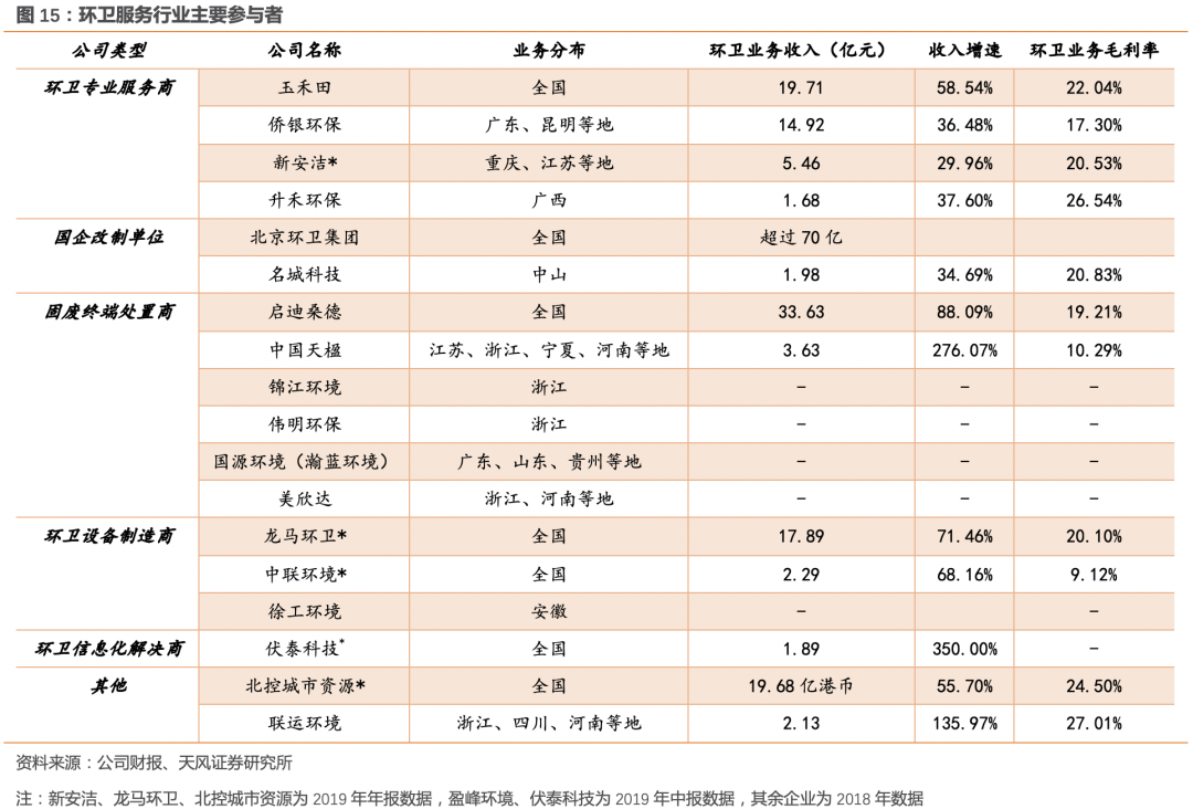1.2. 環(huán)衛(wèi)市場化新增訂單連續(xù)兩年突破2000億元經(jīng)過2015年至今的快速推廣,全國環(huán)衛(wèi)行業(yè)新增年化訂單已經(jīng)達(dá)到550億,同比增長12%;總合同額達(dá)到2223億元,同比略降2%;平均合同期限4年,同比下降0.6年。2018-2019年連續(xù)兩年環(huán)衛(wèi)市場化新增合同總金額突破2000億元,市場化快速推廣。1.3. 本輪環(huán)衛(wèi)市場化快速推進(jìn)的背后,是垃圾分類強(qiáng)制推動(dòng)2018-2019年環(huán)衛(wèi)市場化快速推進(jìn)背后的主要原因,是垃圾分類強(qiáng)制實(shí)施的政策催化。2016年底,習(xí)近平總書記在中央財(cái)經(jīng)領(lǐng)導(dǎo)小組第十四次會(huì)議上強(qiáng)調(diào)普遍推行垃圾分類制度,2017年以來垃圾分類相關(guān)細(xì)化政策不斷出臺(tái)。2019年上海市開始強(qiáng)制垃圾分類,深圳、北京等城市陸續(xù)跟進(jìn),垃圾分類從政策規(guī)劃真正走向落地實(shí)施。垃圾分類市場強(qiáng)制推進(jìn),為環(huán)衛(wèi)市場帶來新的變化。單獨(dú)的垃圾分類招標(biāo)項(xiàng)目增加,垃圾分類成為環(huán)衛(wèi)一體化標(biāo)配作業(yè)內(nèi)容,和環(huán)衛(wèi)服務(wù)打包招標(biāo)。1.4. 2016年以來市容環(huán)境衛(wèi)生類支出持續(xù)增加短期來看,環(huán)衛(wèi)行業(yè)的資金來源仍為財(cái)政資金城市環(huán)境衛(wèi)生支出。根據(jù)住建部統(tǒng)計(jì)年鑒,2018年我國城市、縣城、鎮(zhèn)、鄉(xiāng)、村等合計(jì)環(huán)境衛(wèi)生投資額1267億元,同比增長12.33%。2016以來市容環(huán)境衛(wèi)生類投資支出持續(xù)增加。2. 環(huán)衛(wèi)服務(wù)行業(yè)的市場空間有多大?從傳統(tǒng)環(huán)衛(wèi)向城市物業(yè)管理擴(kuò)容傳統(tǒng)環(huán)衛(wèi)行業(yè)指道路清掃、垃圾清運(yùn)、公廁管理等,而事實(shí)上,隨著政府簡政放權(quán),對(duì)作業(yè)效率和作業(yè)效果的標(biāo)準(zhǔn)日益提高,單位作業(yè)單價(jià)有提升空間,新的公共服務(wù)領(lǐng)域開始市場化,環(huán)衛(wèi)行業(yè)整體市場空間仍有很大擴(kuò)容空間。垃圾分類、綠化養(yǎng)護(hù)、照明維護(hù)等更多內(nèi)容被納入環(huán)衛(wèi)一體化招標(biāo)訂單中,環(huán)衛(wèi)行業(yè)的內(nèi)涵日益豐富,向城市綜合管理服務(wù)邁進(jìn)。2.1. 傳統(tǒng)環(huán)衛(wèi)服務(wù)市場空間近1500億元,2025年可達(dá)2300億按照最新統(tǒng)計(jì)數(shù)據(jù)進(jìn)行的市場空間測算顯示,城市與縣城道路清掃、垃圾清運(yùn)、公廁維護(hù)等市場空間分別為1048億、211億、224億,傳統(tǒng)意義上的環(huán)衛(wèi)服務(wù)市場空間約1483億元。考慮城鎮(zhèn)化帶來的道路面積增加、和物價(jià)上漲帶來的單價(jià)提高,預(yù)計(jì)2025年傳統(tǒng)環(huán)衛(wèi)市場空間會(huì)提高至2296億。2.2. 垃圾分類市場潛在空間800億以上,2025年可釋放近600億垃圾分類是潛在市場空間接近千億的新興市場,涉及垃圾分類設(shè)施、垃圾分選設(shè)備、垃圾分類服務(wù)、推廣宣傳、軟硬件IT服務(wù)、分類實(shí)施效果測評(píng)服務(wù)、咨詢服務(wù)等。2017年垃圾分類試點(diǎn)項(xiàng)目開始釋放,但規(guī)模普遍偏小;2018年以來,大體量垃圾分類項(xiàng)目開始出現(xiàn)。按照城市居民每戶20元/月,縣城居民每戶10元/月的標(biāo)準(zhǔn)進(jìn)行測算,垃圾分類整體市場空間在800億以上。根據(jù)住建部的要求,全國46個(gè)城市在2020年前完成垃圾分類;到2025年,全國地級(jí)及以上城市基本建成生活垃圾分類處理系統(tǒng)。46個(gè)城市對(duì)應(yīng)居民戶數(shù)約1億戶,按照20元/戶/月測算,2020年前將釋放的市場空間約242億;全國地級(jí)以上城市約2.43億戶,到2025年垃圾分類的市場空間將達(dá)到583億。傳統(tǒng)的部門分散管理模式容易產(chǎn)生職能交叉、管理空白,管理責(zé)任機(jī)制弱化等問題,未來城市管理從分散走向綜合是發(fā)展大趨勢(shì),可增強(qiáng)城市管理工作的綜合性、整體性和協(xié)調(diào)性。各地已在陸續(xù)推動(dòng)部門分散管理向綜合管理轉(zhuǎn)變:- 北京已成立城市管理委員會(huì),整合市政市容委全部職責(zé)的基礎(chǔ)上,將多個(gè)市級(jí)部門與城市運(yùn)行管理相關(guān)的職責(zé)一并劃歸,比如發(fā)改委的煤、電、油、氣管理,市商務(wù)委的再生資源回收管理,市園林綠化局的城市綠化帶環(huán)境衛(wèi)生管理,市水務(wù)局的城市河湖周邊環(huán)境衛(wèi)生管理等。同時(shí),財(cái)政預(yù)算維穩(wěn)資金和市政設(shè)施建設(shè)的統(tǒng)籌管理職責(zé),也將劃歸給城市管理委員會(huì)。
