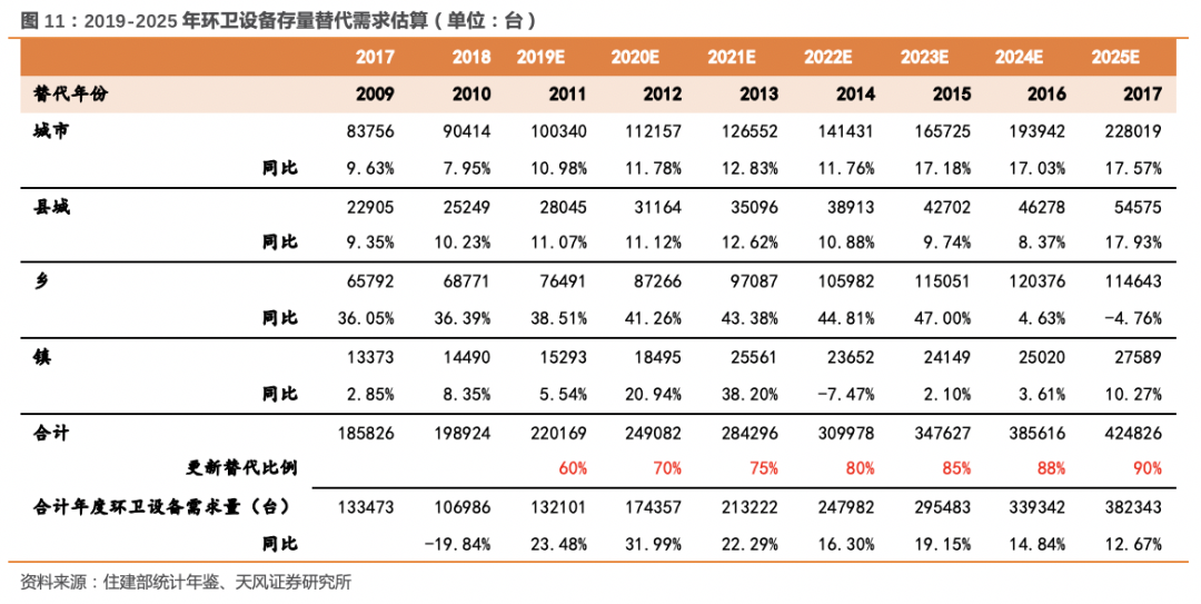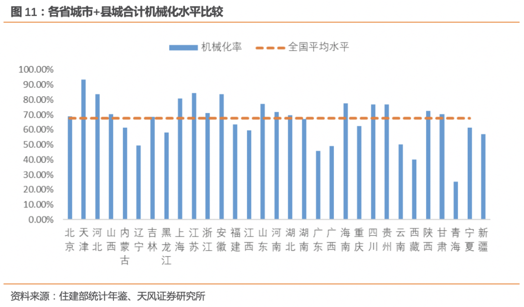根據(jù)住建部的統(tǒng)計(jì)年鑒,2018年我國城市道路機(jī)械化率68.85%、縣城道路機(jī)械化率63.70%,城市和縣城合計(jì)的道路清掃保潔機(jī)械化率約67.68%,達(dá)到基本環(huán)衛(wèi)裝備階段。因經(jīng)濟(jì)發(fā)展水平與地域差異,不同區(qū)域間的機(jī)械化清掃水平存在差異,除省會(huì)城市和經(jīng)濟(jì)較發(fā)達(dá)地級(jí)市外,其他城市和縣城距離實(shí)現(xiàn)全面環(huán)衛(wèi)裝備階段還有差距。3.2. 機(jī)械化率存在提升空間,年度新增設(shè)備需求2-3萬臺(tái)/年根據(jù)住建部相關(guān)文件的要求,到 2020 年底前,地級(jí)及以上城市建成區(qū)道路機(jī)械化清掃率達(dá)到70%以上,縣城達(dá)到 60%以上,京津冀及周邊地區(qū)、長三角地區(qū)、汾渭平原等重點(diǎn)區(qū)域要顯著提高。根據(jù) 2018 年《中國城鄉(xiāng)建設(shè)統(tǒng)計(jì)年鑒》計(jì)算,2018 年我國城市道路清掃面積 86.93億平方米,機(jī)械化清掃面積 59.86億平方米,機(jī)械化清掃率為 68.85%;縣城道路清掃保潔面積 25.56億平方米,機(jī)械化清掃面積16.80億平方米,機(jī)械化清掃率僅為 63.70%。我們基于機(jī)械化率提升和單位面積環(huán)衛(wèi)車輛的假設(shè),對(duì)新增環(huán)衛(wèi)車輛市場需求進(jìn)行估算,假設(shè)2019-2025年:- 城市道路清掃保潔面積年均復(fù)合增速3%左右,城市機(jī)械化率可逐步提升至80%,單位面積環(huán)衛(wèi)車輛維持0.42萬臺(tái)/億平米;