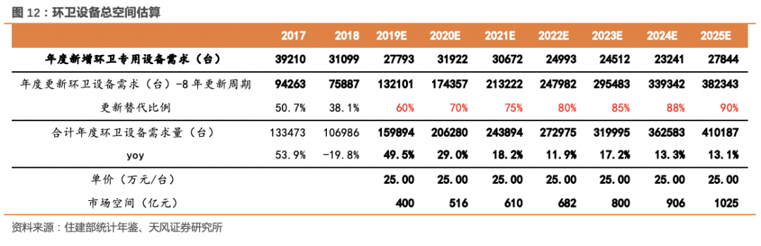 估算結(jié)果預(yù)計(jì)到2025年全國環(huán)衛(wèi)專用設(shè)備保有量將達(dá)到65萬臺(tái),2019-2025年年新增環(huán)衛(wèi)專用設(shè)備需求量分別約2-3萬臺(tái)/年。3.3. 環(huán)衛(wèi)裝備折舊期5-10年,存量替代需求崛起由于環(huán)衛(wèi)設(shè)備折舊年限5-10年,我們按照折舊期限8年進(jìn)行估算,考慮到設(shè)備技術(shù)更迭帶來的效率提升,更新后的設(shè)備作業(yè)效率更高,設(shè)備替代存在一定比例折扣,我們假設(shè)2019年更新設(shè)備的替代比例為60%(替代2011年環(huán)衛(wèi)設(shè)備),2020年更新設(shè)備的替代比例為70%(替代2012年環(huán)衛(wèi)設(shè)備),以此類推假設(shè)2021-2025年的替代比例分別為75%、80%、85%、88%、90%。測算得到2019-2025年年度環(huán)衛(wèi)設(shè)備存量替代需求逐年增長,到2025年,年度環(huán)衛(wèi)設(shè)備存量替代需求將達(dá)到38萬臺(tái)。3.4. 整體市場空間測算:存量更新需求崛起,到2025年市場空間可達(dá)1025億元綜上所述,道路清掃面積增加與機(jī)械化率提升帶動(dòng)環(huán)衛(wèi)車輛保有量提升,存量環(huán)衛(wèi)車輛更新替代帶來更大需求量,新增+存量替代合計(jì)產(chǎn)生的年度環(huán)衛(wèi)設(shè)備需求量將逐年遞增,測算到2025年將達(dá)到41萬臺(tái),按照25萬元/臺(tái)的單價(jià)估算,單年度釋放市場空間1000億元。2020-2025年合計(jì)市場空間約4540億元。4. 環(huán)衛(wèi)服務(wù)業(yè)的競爭格局如何?市場分散,行業(yè)集中度提升趨勢(shì)明顯4.1. 商業(yè)模式:輕資產(chǎn)、周轉(zhuǎn)快、現(xiàn)金穩(wěn)相對(duì)其他環(huán)保細(xì)分子行業(yè),環(huán)衛(wèi)服務(wù)業(yè)具有以下特點(diǎn):- 建設(shè)周期短:從項(xiàng)目取得到實(shí)施運(yùn)營,一般不超過3個(gè)月,建設(shè)期的準(zhǔn)備工作主要是環(huán)衛(wèi)設(shè)備采購和人員培訓(xùn);