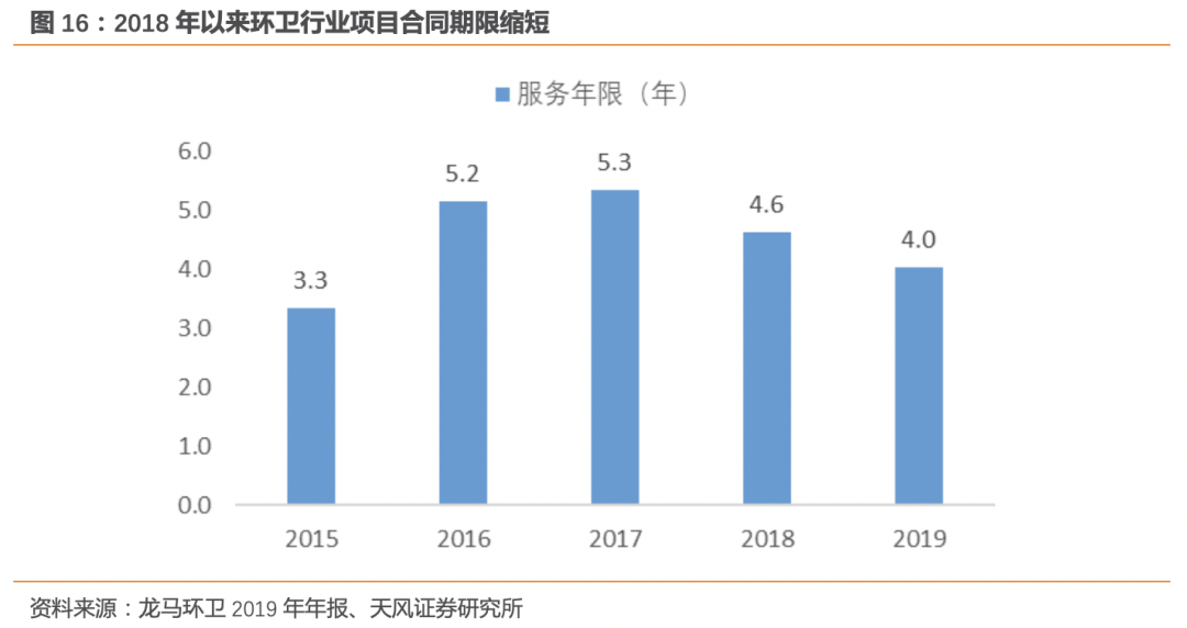 4.2. 行業(yè)參與者增多,跑馬圈地正當(dāng)時(shí)環(huán)衛(wèi)行業(yè)巨大的市場空間和良好的商業(yè)模式,吸引各方社會(huì)資本加入,2018年行業(yè)參與者約4000余家,前五大企業(yè)市場份額約11.4%。目前行業(yè)內(nèi)參與者可大致分為以下幾類:環(huán)衛(wèi)專業(yè)服務(wù)商如玉禾田、僑銀環(huán)保、新安潔、升禾環(huán)保等;國企改制單位,如北京環(huán)衛(wèi)集團(tuán)、名城科技等;固廢終端處置商,如啟迪桑德、中國天楹、錦江環(huán)境等;環(huán)衛(wèi)設(shè)備制造商,如龍馬環(huán)衛(wèi)、中聯(lián)環(huán)境;環(huán)衛(wèi)信息化解決商,如伏泰科技;以及其他新進(jìn)入者,如北控城市資源、聯(lián)運(yùn)環(huán)境等。4.3. PPP模式預(yù)期升溫,資金門檻提升環(huán)衛(wèi)服務(wù)按照政府招標(biāo)模式一般分為政府購買服務(wù)或PPP兩類,政府購買服務(wù)一般運(yùn)營期限較短,約3-5年;PPP模式的環(huán)衛(wèi)項(xiàng)目一般體量較大,運(yùn)營期限約15-30年。2018年P(guān)PP模式降溫,平均合同期有所縮短:行業(yè)發(fā)展初期訂單以政府購買服務(wù)方式為主;2016-2017年P(guān)PP模式訂單快速增長,訂單平均運(yùn)營期限拉長;2018年以來,受PPP政策監(jiān)管影響,PPP模式訂單增速放緩,訂單平均運(yùn)營期限有所縮短。自2019年下半年以來,PPP模式類項(xiàng)目預(yù)期有所升溫,主要由于垃圾分類帶動(dòng)下的中轉(zhuǎn)設(shè)備、中轉(zhuǎn)設(shè)施、末端處置設(shè)施建設(shè)資金需求,帶動(dòng)環(huán)衛(wèi)訂單從單一的環(huán)衛(wèi)清掃保潔,向環(huán)衛(wèi)一體化方向發(fā)展,PPP模式類項(xiàng)目往往伴隨著前期資金的投入,將提高行業(yè)資金門檻。4.4. 二次市場化帶來新機(jī)遇,提升環(huán)衛(wèi)行業(yè)集中度雖然環(huán)衛(wèi)行業(yè)市場化訂單整體增速有所放緩,但我們注意到隨著首次市場化的環(huán)衛(wèi)項(xiàng)目合同到期,大量環(huán)衛(wèi)項(xiàng)目迎來二次市場化。在城市管理由分散走向綜合,以及大力發(fā)展垃圾分類的背景下,二次市場化的環(huán)衛(wèi)項(xiàng)目普遍具有規(guī)?;⒁惑w化、智能化的趨勢(shì),行業(yè)進(jìn)入門檻提高,行業(yè)集中度將不斷提升。以深圳市環(huán)衛(wèi)項(xiàng)目為例,深圳市現(xiàn)有的環(huán)衛(wèi)管理業(yè)務(wù)包括“市政道路清掃保潔、生活垃圾收集、運(yùn)輸及處理,公廁管理等”,實(shí)行市、區(qū)、接到三級(jí)管理體制。1984年,深圳市在全國率先推動(dòng)道路清掃保潔市場化;1993年,深圳市環(huán)衛(wèi)處將清掃保潔業(yè)務(wù)管理權(quán)限移交給區(qū)一級(jí);1999年,深圳市環(huán)衛(wèi)處將垃圾運(yùn)輸作業(yè)管理權(quán)限下放到區(qū)一級(jí);2019年深圳市引入環(huán)衛(wèi)PPP模式:- 2019年9月27日,深圳市第一個(gè)環(huán)衛(wèi)PPP項(xiàng)目——深圳市福田區(qū)政府環(huán)衛(wèi)PPP項(xiàng)目公開招標(biāo),盈峰環(huán)境全資子公司中聯(lián)環(huán)境中標(biāo),總金額11.53億元,服務(wù)周期10年。