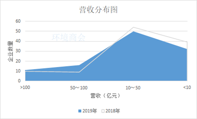 從營(yíng)收分布來(lái)看,相較于2018年,2019年度營(yíng)收在50億~100億區(qū)間的企業(yè)數(shù)量有所提升,從9家上升至16家,營(yíng)收在10億~50億的企業(yè)數(shù)量為50家,低于10億有32家。其中,高能環(huán)境、瀚藍(lán)環(huán)境、洪城水業(yè)等營(yíng)收首破50億。