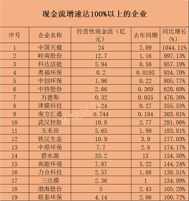 從增長(zhǎng)幅度來(lái)看,有63家企業(yè)現(xiàn)金流正增長(zhǎng),占比超七成,另有23家下降。在2018年、2019年經(jīng)營(yíng)性現(xiàn)金流均為正流入的企業(yè)中,增長(zhǎng)幅度超50%的企業(yè)有28家,其中中國(guó)天楹(1044.11%)、嶺南股份(997.13%)、科達(dá)潔能(957.19%)、奧福環(huán)保(934.70%)、中創(chuàng)環(huán)保(805.77%)、中持股份(620.69%)等增長(zhǎng)頗為強(qiáng)勁。