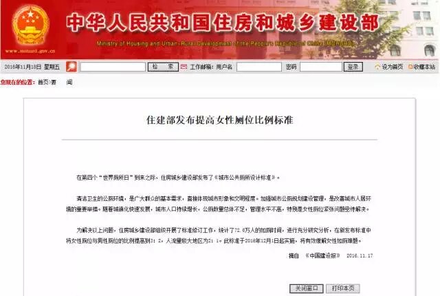 在第四個“世界廁所日”到來之際,住建部網站發(fā)布新標準,將女性廁位與男性廁位比例提高到3:2,人流量較大地區(qū)為2:1,以緩解女性廁位緊張的問題。此標準將于今年12月1日起實施。