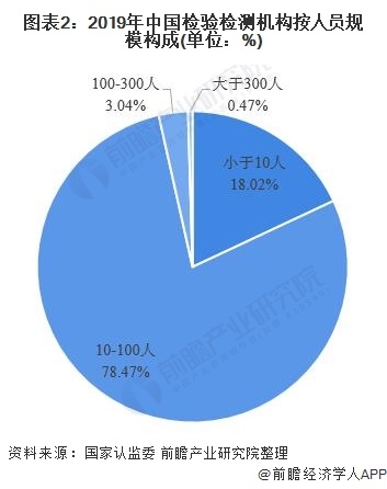 雖然我國檢驗(yàn)檢測產(chǎn)業(yè)規(guī)模不斷擴(kuò)大、產(chǎn)業(yè)結(jié)構(gòu)持續(xù)優(yōu)化、科研創(chuàng)新能力不斷增強(qiáng),但“小、散、弱”的基本面貌仍未改變。目前,我國檢驗(yàn)檢測機(jī)構(gòu)主要以規(guī)模在10-100人的為主,2019年,全國10-100人的檢驗(yàn)檢測機(jī)構(gòu)占78.47%,而100-300人的檢驗(yàn)檢測機(jī)構(gòu)僅占3.04%;300人以上的更是不足1%。