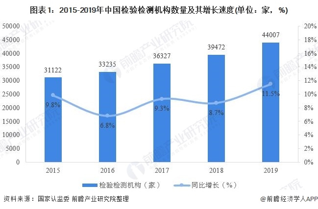 據(jù)國家認(rèn)監(jiān)委統(tǒng)計數(shù)據(jù)顯示,2015年以來,我國檢驗(yàn)檢測機(jī)構(gòu)數(shù)量持續(xù)增長,截至到2019年底,全國檢驗(yàn)檢測機(jī)構(gòu)數(shù)量突破4萬家,達(dá)到44007家,同比增長11.5%。