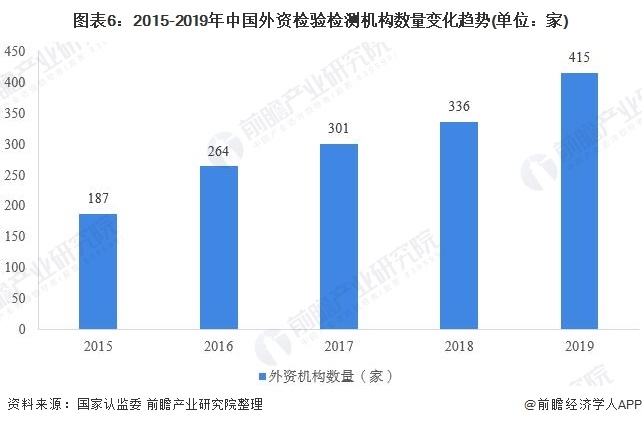 近年來,在國內(nèi)民營企業(yè)快速發(fā)展的同時,外資檢驗(yàn)檢測機(jī)構(gòu)也迅速進(jìn)入中國市場,2015年,全國外資檢驗(yàn)檢測機(jī)構(gòu)僅187家,到2019年底,全國外資檢驗(yàn)檢測機(jī)構(gòu)數(shù)量達(dá)到415家,同比增長23.51%;實(shí)現(xiàn)營業(yè)收入238.25億元,同比增長18.71%。