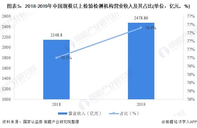 在政府和市場雙重推動之下,一大批規(guī)模大、水平高、能力強(qiáng)的中國檢驗(yàn)檢測品牌正在快速形成,檢驗(yàn)檢測機(jī)構(gòu)集約化發(fā)展取得成效。截至到2019年底,全國規(guī)模以上(年收入1000萬元以上)檢驗(yàn)檢測機(jī)構(gòu)數(shù)量為5795家,較上年增加794家。營業(yè)收入達(dá)到2478.86億元,占全行業(yè)總收入的76.9%,份額進(jìn)一步提升。