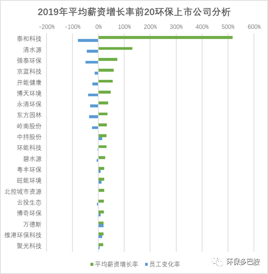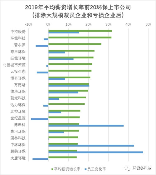 多就是多,少就是少,在此沒有必要對個別企業(yè)作單獨展開。咱說說整體情況,2019年,百余家環(huán)保上市公司為超過40萬員工支付的薪酬為464.8億元,平均年薪為11.41萬元,較2018年增長了1.84萬元。聽起來還不錯,但注意這是企業(yè)端的薪金成本,并非員工到手的收入,不精細(xì)地推算,對應(yīng)員工平均月薪為稅前8300元。智聯(lián)招聘針對2019年冬季求職行業(yè)平均薪酬的調(diào)查數(shù)據(jù)顯示環(huán)保行業(yè)平均薪酬為8070元。將本文研究對象為水準(zhǔn)偏高的環(huán)保上市公司這一因素考慮在內(nèi),兩個結(jié)果實際是高度吻合的。做環(huán)保的企業(yè),哪家還沒個Big Dream?當(dāng)下的收入重要,未來的錢景,也即收入的增長勢頭也同樣重要。為此,我將2019年平均薪資增長率前20位的環(huán)保上市公司摘出,得到如下結(jié)果: