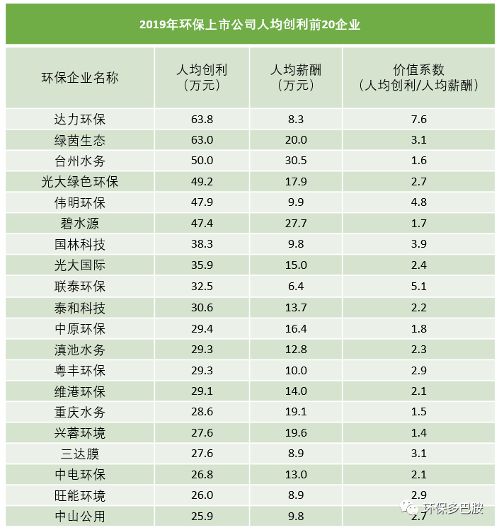 本來這部分研究是期望將平均薪資增長率排在前列的企業(yè)篩選出來,作為對求職者的選擇參考。結(jié)果發(fā)現(xiàn)前9位企業(yè)的平均薪資增長竟然無一例外伴隨著員工數(shù)顯著減少,并且其中兩家企業(yè)2019年的凈利潤為負(fù)。我們當(dāng)然理解為應(yīng)對行業(yè)波動企業(yè)需做出一定的人員優(yōu)化,但平均薪資的增長的動能若主要來自于人員優(yōu)化,并且人員優(yōu)化并未帶來企業(yè)的扭虧為盈,或許這家公司就并非一個就業(yè)的理想選擇。為此,再設(shè)立“年員工變化率>-20%;2019年凈利為正”兩項標(biāo)準(zhǔn),重新篩選滿足條件的薪資增長率前20環(huán)保上市公司,這次得到的結(jié)果似乎更值得求職者參考。當(dāng)然,開工資也并非是個比誰慷慨給得多的游戲。在任何組織,個人的收入都是應(yīng)該與貢獻的價值所掛鉤的。這是現(xiàn)代雇傭制的邏輯基礎(chǔ)。將企業(yè)凈利與員工數(shù)相除,可得出企業(yè)的人均創(chuàng)利——這可以衡量企業(yè)每個“人”創(chuàng)造的貨幣價值。而人均創(chuàng)利與人均薪酬的比值,則衡量了企業(yè)經(jīng)營管理視角下雇傭員工的“收益率”。如果在一百年前,這類數(shù)值或許可以用來控訴資本家的剝削。但在當(dāng)下,這或許被理解為企業(yè) “平臺價值”和“精細(xì)化管理水平”的衡量尺度更為合適。從此分析視角,將人均創(chuàng)利前20的環(huán)保企業(yè)數(shù)據(jù)整理如下。數(shù)字本身很清晰,每個企業(yè)數(shù)據(jù)背后的冷暖和故事各有各的理解,我個人不能也不必過度展開,仁者見仁智者見智就好。在此僅分析行業(yè)整體的兩個點:第一,2019年行業(yè)整體的人均創(chuàng)利水平是7.6萬元。既不如人均薪酬的11.4萬元,也較2018年人均創(chuàng)利數(shù)據(jù)的7.8萬元有所減少。第二,將上百家環(huán)保企業(yè)的人均創(chuàng)利數(shù)據(jù)分別和人均薪酬以及研究生以上員工比例做回歸分析,得到的線性回歸決定系數(shù)R2分別是0.0297和0.0049——這說明整體而言,環(huán)保企業(yè)的人均創(chuàng)利和公司開多少錢只能說弱相關(guān),和公司的高素質(zhì)人才比例則是更弱地相關(guān)。換言之,至少在本研究視角,環(huán)保企業(yè)整體的激勵措施的有效性很弱,而高素質(zhì)人才隊伍的打造對人均產(chǎn)出率的加成則更加沒有效果。這是個多少讓人感到遺憾和沮喪的結(jié)論。整體情況并不樂觀,本來想說期望這種情況能盡快得到逆轉(zhuǎn),但考慮到2020年的噩夢難度開局,或許環(huán)保企業(yè)和個人還得再扛一扛。