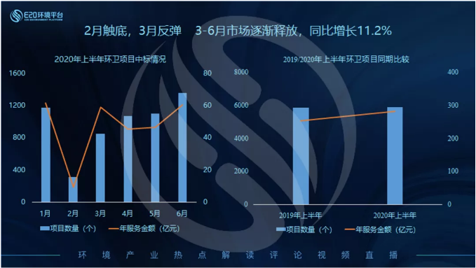 1、和2019年同期相比,2020年上半年環(huán)衛(wèi)市場釋放項(xiàng)目數(shù)量有所增加,新增年服務(wù)金額總額較2019年同期增長11.2%,疫情壓制下逆勢上揚(yáng)。