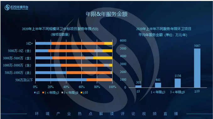 也正如前面所講的,對比分析了E20關(guān)注的環(huán)衛(wèi)十大影響力入圍企業(yè)2020年上半年市場表現(xiàn),發(fā)現(xiàn)他們10年以上長服務(wù)期項(xiàng)目業(yè)績表現(xiàn)突出,尤其十大影響力企業(yè)拿到了超一半的10年以上項(xiàng)目。年服務(wù)金額在5000萬元/年以上的項(xiàng)目中,環(huán)衛(wèi)十大影響力企業(yè)也拿到了約33%的份額。讓我們期待下半年這些公司再創(chuàng)佳績。