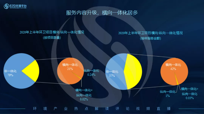 2020年上半年環(huán)衛(wèi)市場橫縱向一體化情況,按照年服務(wù)金額劃分,可以看到非一體化環(huán)衛(wèi)項(xiàng)目所占市場份額約57%,橫向、縱向一體化環(huán)衛(wèi)項(xiàng)目的年服務(wù)金額總額占到整體份額的43%。