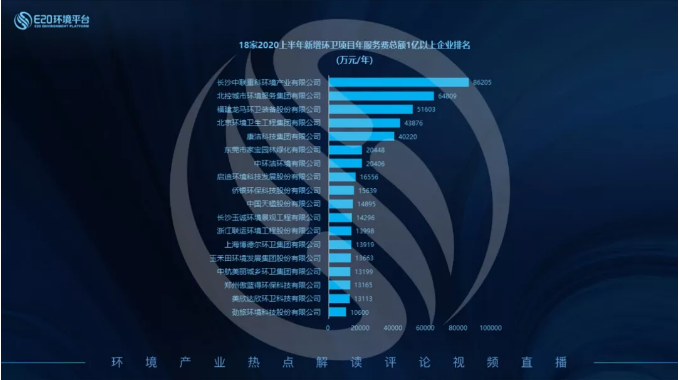 7、2017年是環(huán)衛(wèi)市場化元年,那2019年則是環(huán)衛(wèi)資本化元年,2020年半年已過,E20研究院數(shù)據(jù)中心對環(huán)衛(wèi)企業(yè)2020年上半年業(yè)績進(jìn)行了盤點(diǎn)和大排名,其中18家環(huán)衛(wèi)企業(yè)2020年上半年新增環(huán)衛(wèi)項(xiàng)目年服務(wù)費(fèi)超過1億。另外,排名中可以看到環(huán)衛(wèi)上市公司7家均在“億元戶”光榮榜上大榜有名,盈峰中聯(lián)、北控城市服務(wù)上半年新增業(yè)績最為突出,半年新增年服務(wù)費(fèi)總額分別為8億和6億。