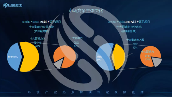 8、對比分析了E20關(guān)注的環(huán)衛(wèi)十大影響力入圍企業(yè)2020年上半年市場表現(xiàn),發(fā)現(xiàn)他們10年以上長服務(wù)期項(xiàng)目業(yè)績表現(xiàn)突出,尤其十大影響力企業(yè)拿到了超一半的10年以上項(xiàng)目。年服務(wù)金額在5000萬元/年以上的項(xiàng)目中,環(huán)衛(wèi)十大影響力企業(yè)也拿到了約33%的份額。讓我們期待下半年這些公司再創(chuàng)佳績,2020年年底,我們將在北京迎來2020年度中國環(huán)衛(wèi)十大影響力企業(yè)評選,歡迎大家繼續(xù)關(guān)注與參與,讓我們在2020年第十四屆固廢戰(zhàn)略論壇再聚首,熱論弄潮英雄。