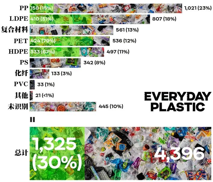 如果按照塑料種類來說,這些塑料垃圾一半以上為PP(如意大利面包裝袋)、LDPE(如吐司面包包裝袋)和復(fù)合塑料(如薯片包裝袋)。而PET(如飲料瓶)和HDPE(如牛奶桶)這兩種英國體系中最容易被回收利用的塑料的占比卻不到四分之一。