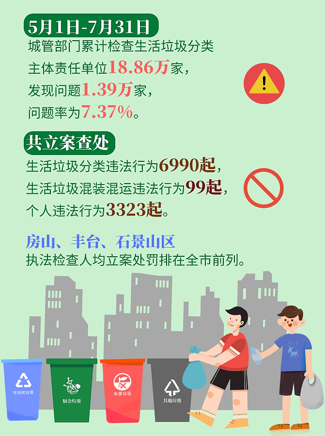 在此背景下,垃圾分類(lèi)檢查執(zhí)法力度加強(qiáng)。5月1日至7月31日,執(zhí)法部門(mén)針對(duì)個(gè)人違法行為共查處3323起,查處個(gè)人違法行為的立案量占全部立案量的比例為58.20%。