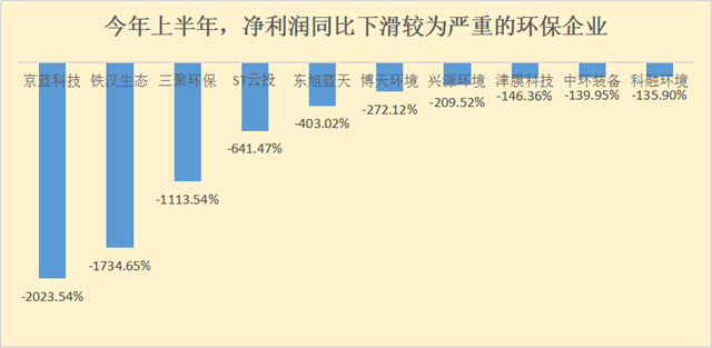 虧損幅度較為嚴(yán)重的當(dāng)屬京藍科技、鐵漢生態(tài)和三聚環(huán)保,凈利潤分別較去年同期下降了-2023.54%、-1734.65%和-1113.54%,經(jīng)營狀況惡化。