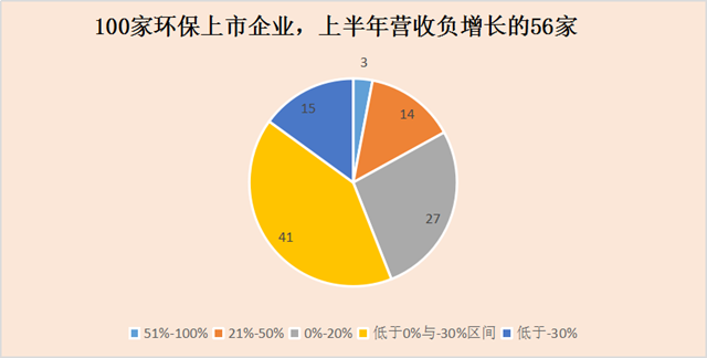 營收變動幅度方面,數(shù)據(jù)不那么喜人。100家環(huán)保上市企業(yè),上半年營收同比下滑,負(fù)增長有56家,接近6成。也就是說,一半以上的企業(yè)主營業(yè)務(wù)收入都不及往年。(如圖四)